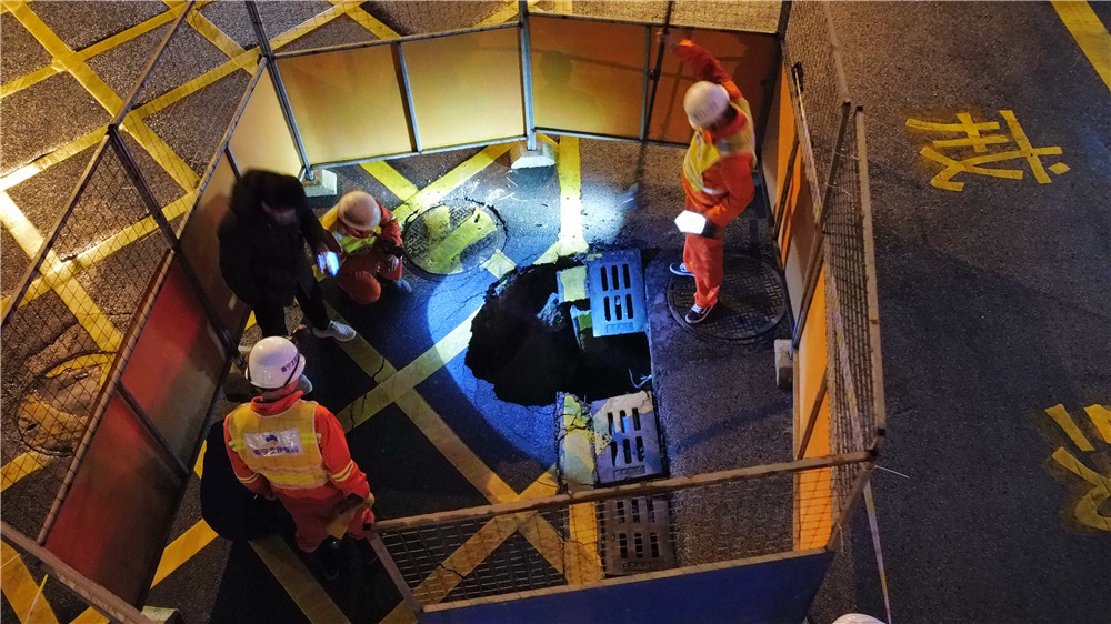 由于搶修位置地下管線復(fù)雜,施工場地狹窄,施工過程中,既要保障消防車輛正常出入,又要保護(hù)地下管線,同時陰雨連綿的天氣,給施工造成極大不便。搶險人員想方設(shè)法,克服重重困難全力推進(jìn),經(jīng)過連夜奮戰(zhàn),第二天下午16時,已完成塌陷井室修復(fù)、基坑灌注混凝土工作,目前正進(jìn)行混凝土養(yǎng)護(hù),預(yù)計2月19日前完成最后瀝青路面恢復(fù)工作。